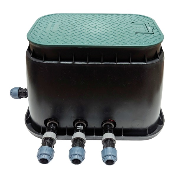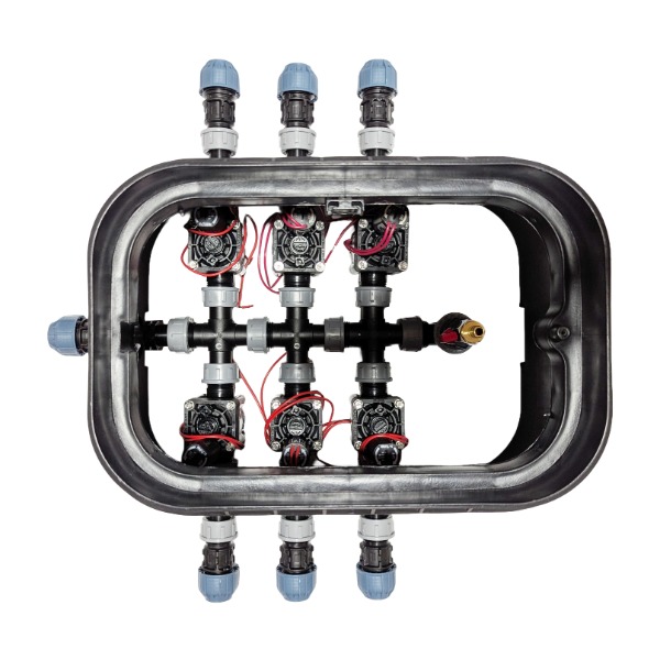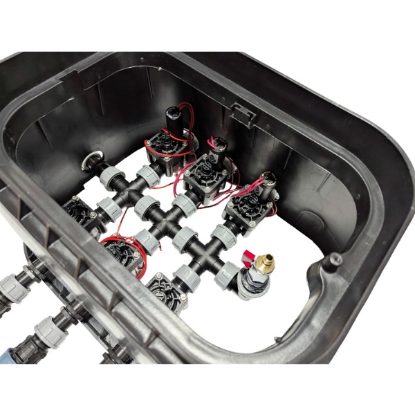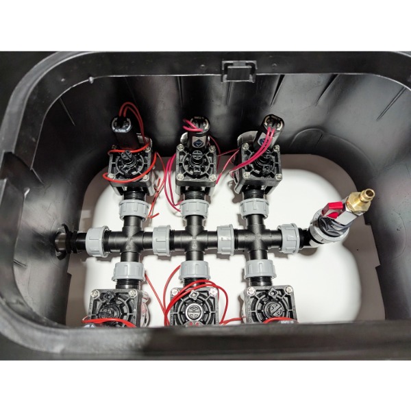 Fertiger Ventilkasten für 6 Bewässerungszonen – 6 Hunter PGV-Magnetventile vormontiert, direkt einbaubereit